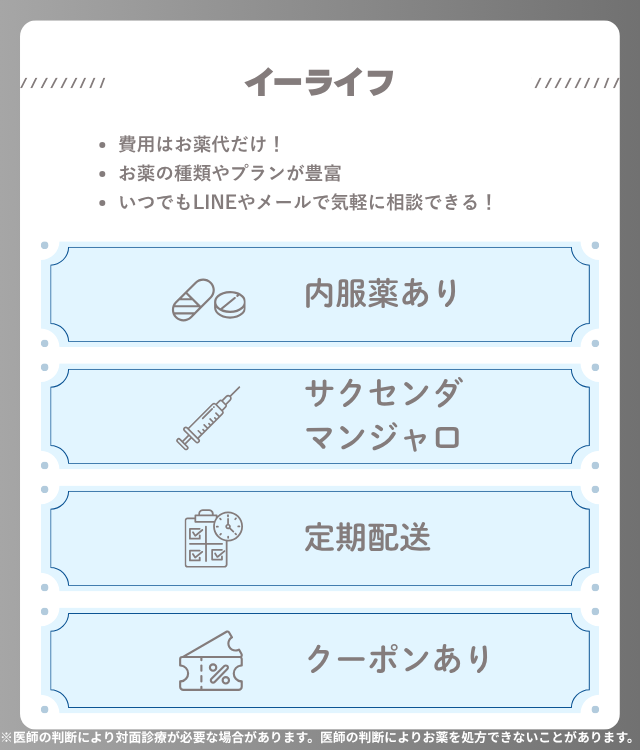 イーライフは、診察料と送料がともに不要で、費用を抑えて始めたい人に向いている。