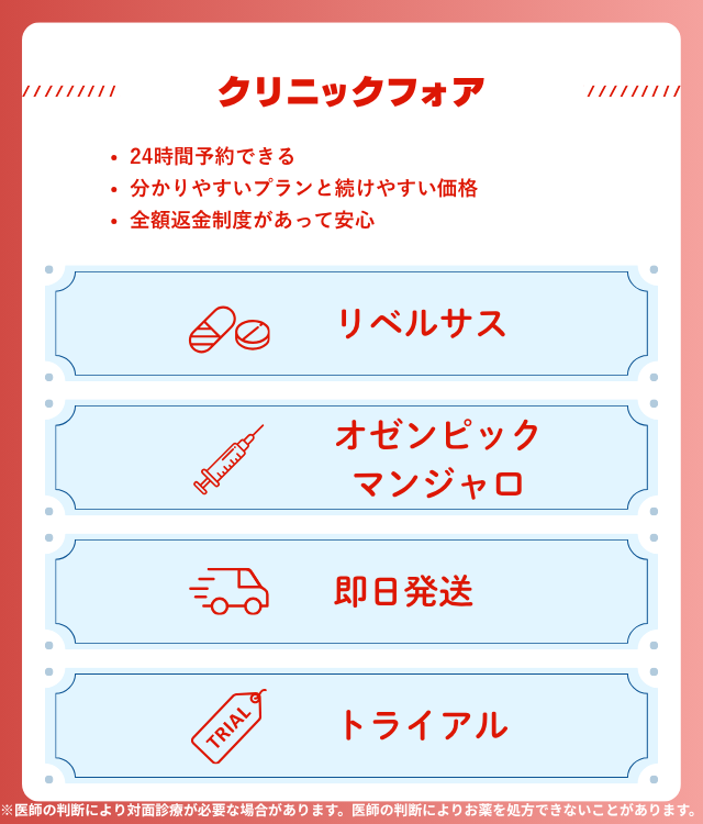 クリニックフォアは、GLP-1ダイエット注射だけでなく、内服タイプの薬も取り扱っている点が特徴である。患者のライフスタイルや希望に合わせて治療法を柔軟に選べるため、注射に抵抗のある人でも利用しやすい。