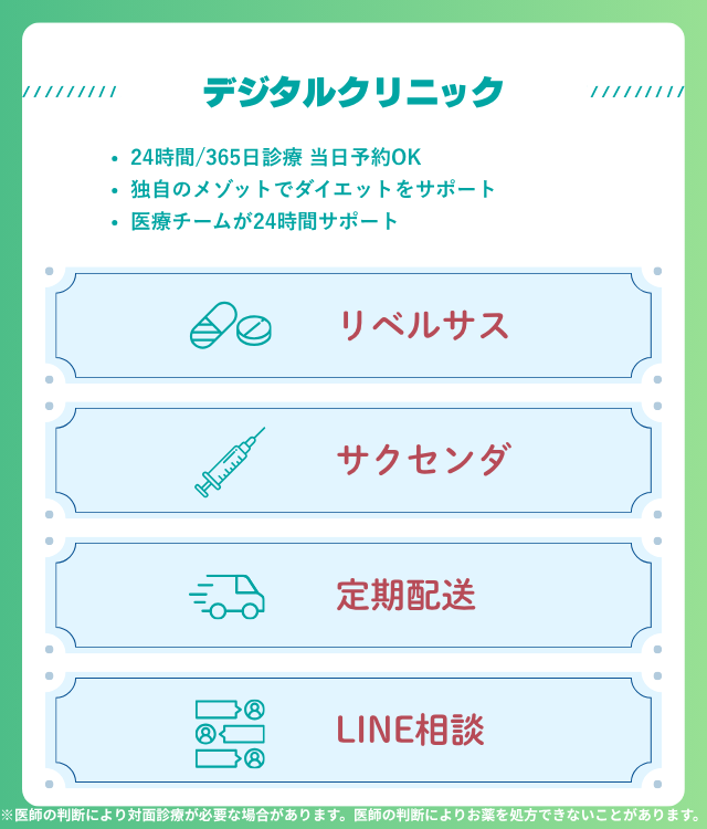 DMMオンラインクリニックは、24時間いつでもオンライン診療を受けられる。忙しい人でもライフスタイルに合わせてGLP-1ダイエット注射を始めやすいのが特徴である。