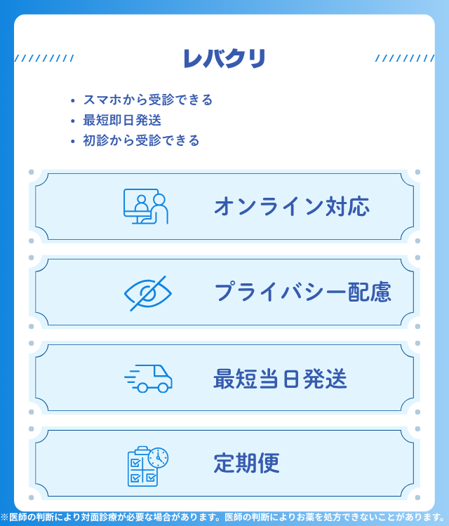薬の発送は当日対応、最短で翌日には自宅に届く。人目を気にせず治療を受けたい人や、丁寧なサポートを求める人に向いている。